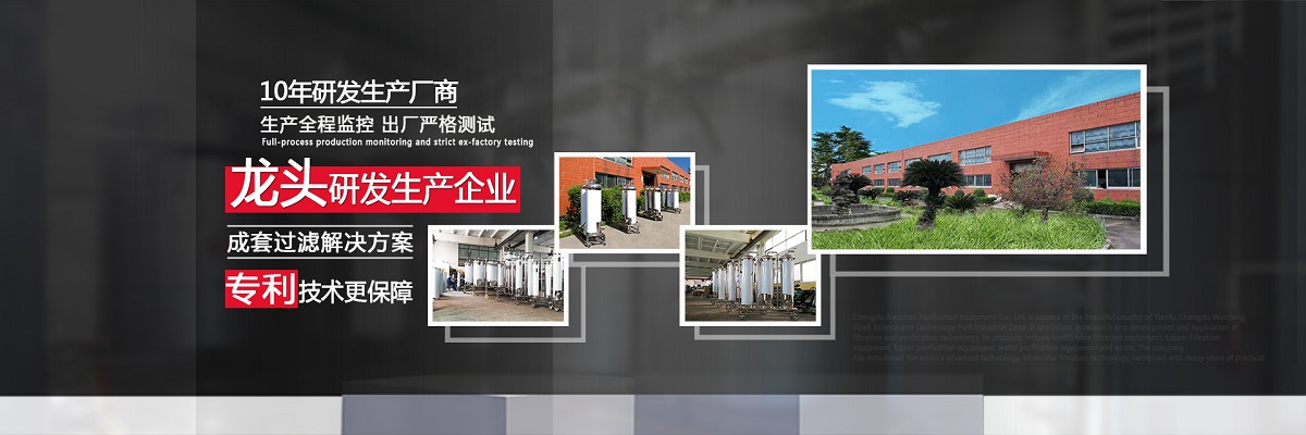 成都愛爾純凈化設備有限公司,坐落于美麗的天府之國,成都市溫江區海峽科技園工業區,專業從事于過濾、凈化技術的研發應用,產品有保健酒過濾設備、白酒過濾設備、白酒凈化設備、水凈化設備等,公司引進世界先進過濾分子技術,結合專業技術人員資深多年實踐經驗,解決酒類、飲水類后期處理難題。 業務涵蓋,酒類過濾:除混濁沉淀,澄清處理、除苦味,異雜味,新酒催熟陳化處理 、除塑化劑、固形物、雜醇油、甲醇及各類含量超標后期處理。 水類:軟水、純凈水、礦泉水、飲料等凈化處理。用心為客戶提高生產效率、提高產品質量、降低生產成本、環保減排而開發創新,堅持奮斗。 公司至誠每一位客戶,“誠信服務,客戶至上”為宗旨,為客戶要求,用心凈化每一點滴,我們都將以精準的數據化設計、嚴格的設備制作質量把關、快捷專業的安裝調試以及周到的售后服務,解決客戶生產過程中遇見的各種酒、水后期處理的技術難題。